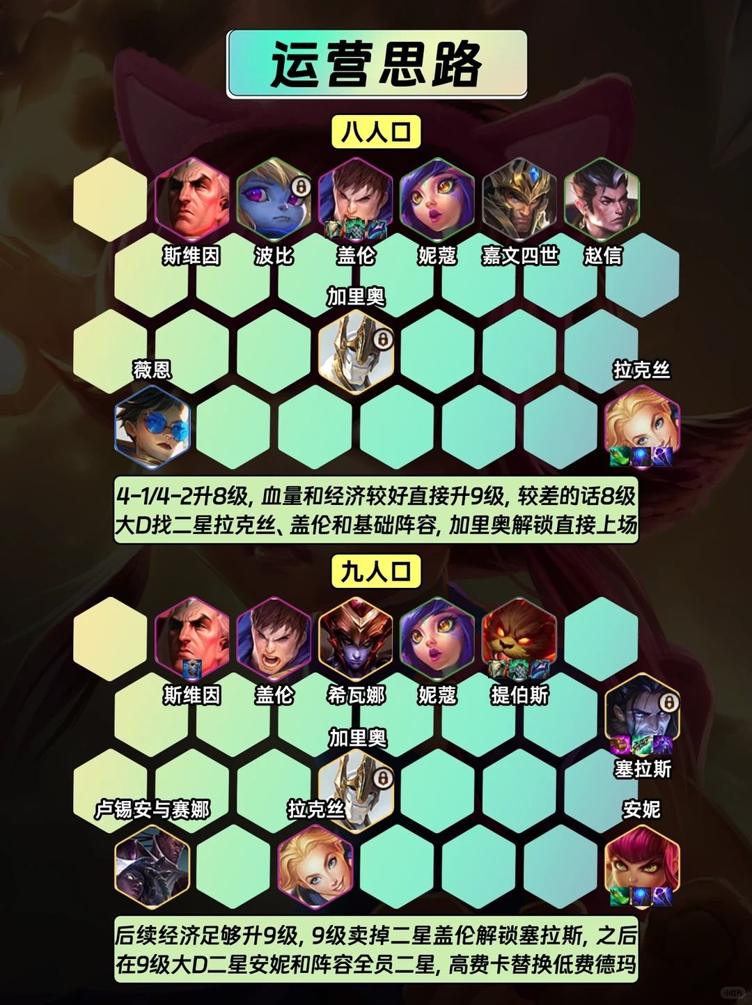 4-1/4-2升8级,血量和经济较好直接升9级,较差的话8级大D找二星拉克丝、盖伦和基础阵容,加里奥解锁直接上场
