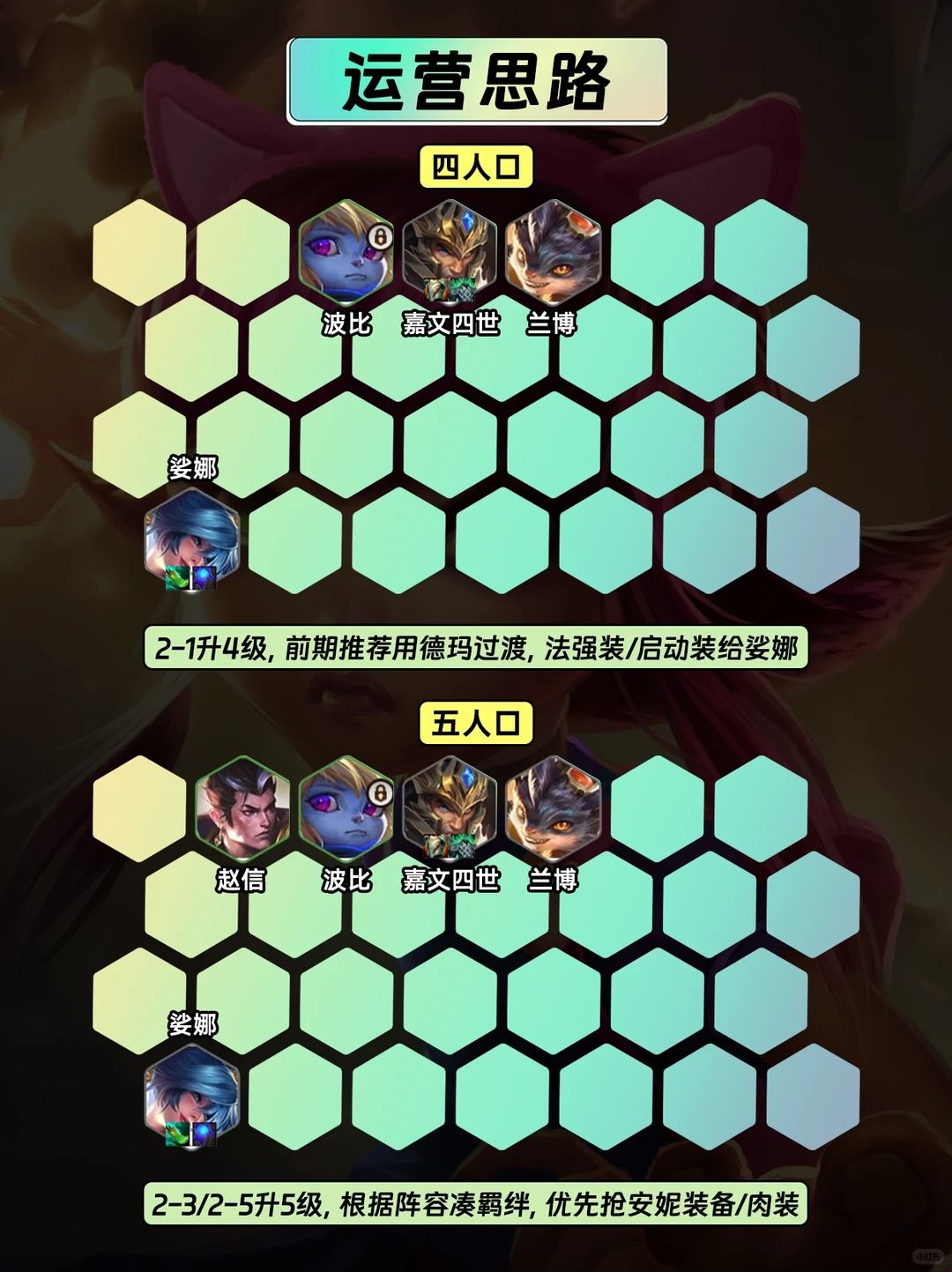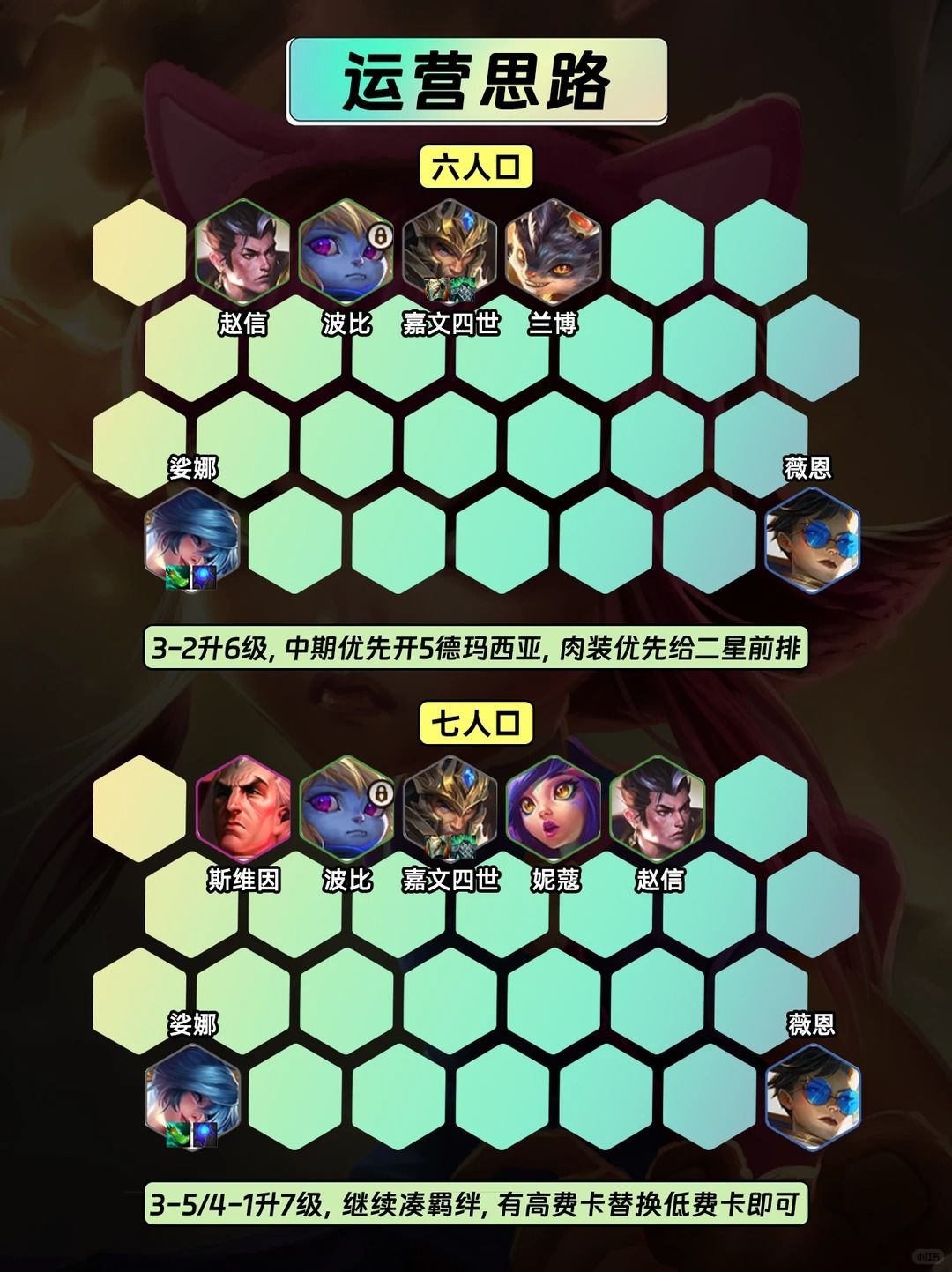 3-5/4-1升7级,继续凑羁绊,有高费卡替换低费卡即可