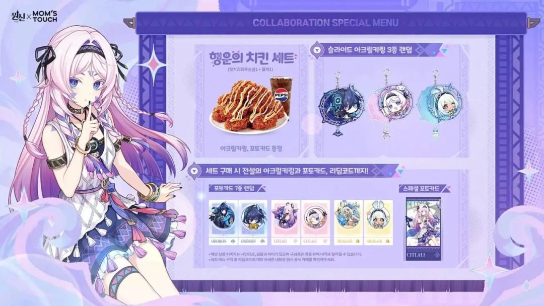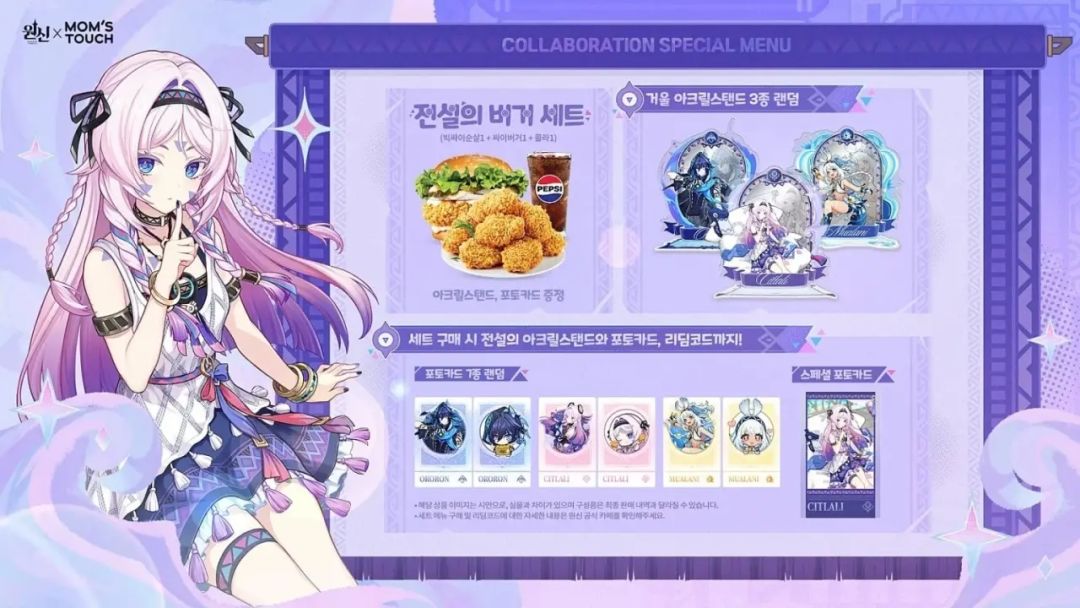 据悉,本次联动以须弥新角色茜特菈莉为核心宣传形象,枫丹的欧洛伦与纳塔的玛拉妮也将一同登场,活动推出两款限定主题套餐,购买即可获得包括 随机角色亚克力立牌、滑动式钥匙扣、特制收藏卡在内的精美周边,这是继《崩坏:星穹铁道》后,米哈游旗下IP再度与Mom's Touch合作,寄托了米哈游希望通过深度的本地化餐饮联动,进一步巩固其在韩国市场的巨大影响力的野心,并为茜特菈莉的推广助力![[TapTap表情|TapFamilyxdoro2_粉狗发射]](https://img-tc.tapimg.com/market/images/934f58613a089b2e214eb0e0638bbbad.gif)