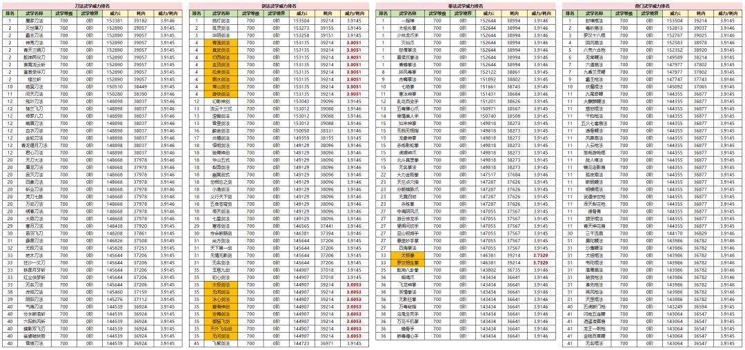),绝大部分武学的威力耗内比是定值,约为3.9145。只有18个武学是例外,青莲剑法等8个剑法武学是3.9051,太极剑法等8个剑法武学是3.6953,以及太极拳和罗汉相生拳2个拳法武学是3.7329。