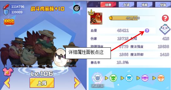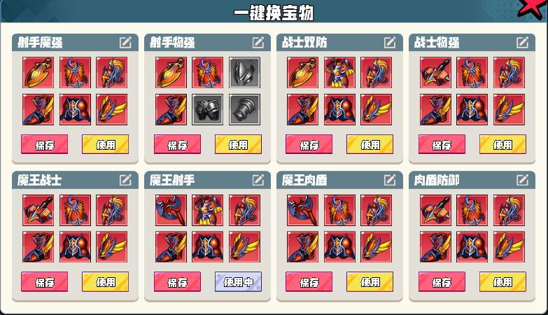 推图部分比较简单,破防是推图的核心思路(你的家族强度>怪的防御),一般使用射手推图(用战士或肉盾,属于大佬的骚操作而已)。当前推图射手推荐战斗鸡或火芯灵。推图留2套宝物,单魔强一套或单物强一套(在精英关卡中会切换使用)。看下图:
