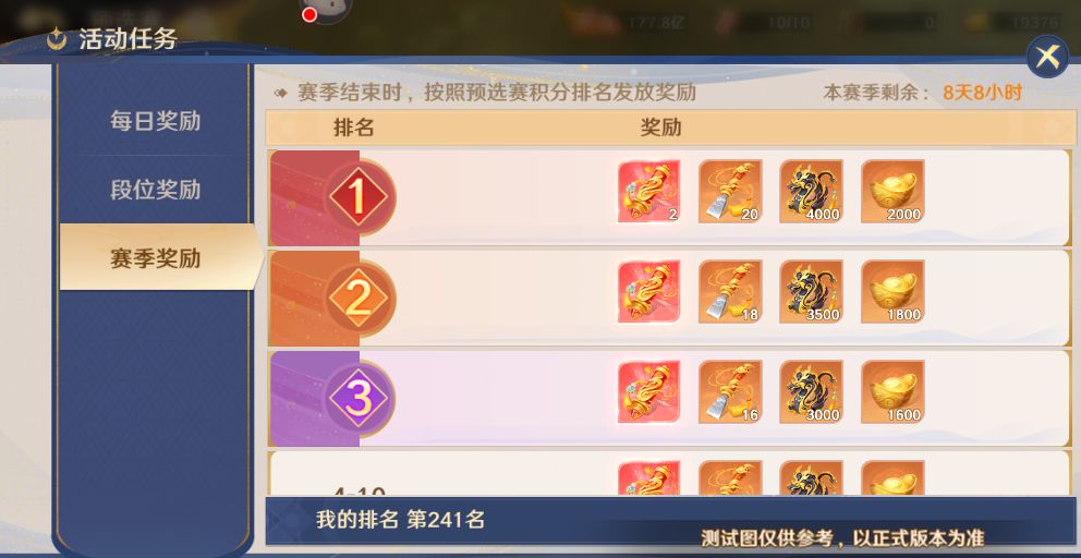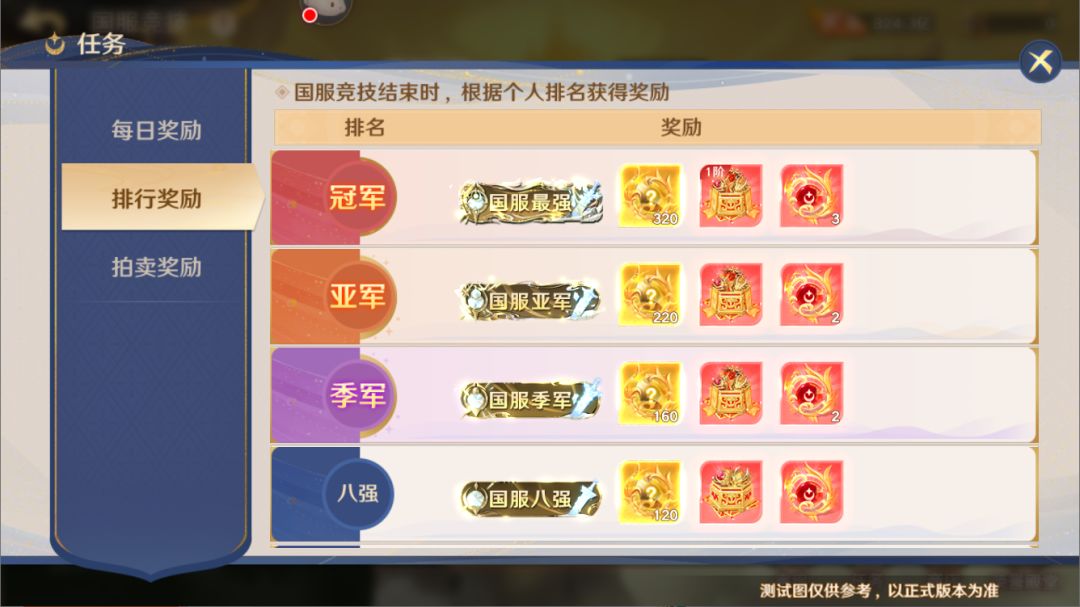 在国服竞技全部结束后,我们将根据个人排名发放排行奖励。