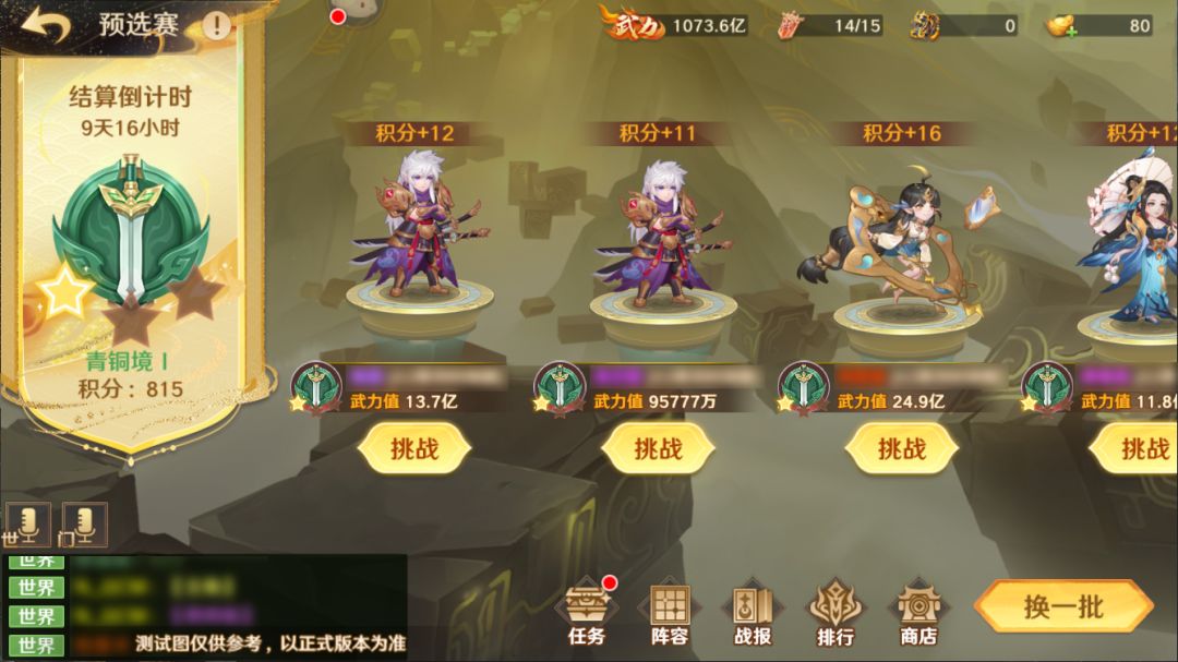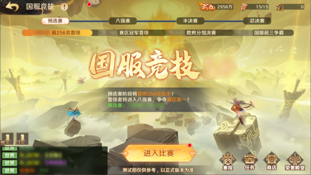 在国服竞技中,所有参赛者初始分数一致,且每天可获得15个挑战令,每次发起挑战将消耗1个挑战令。预选赛采用段位制。根据参赛者获得的积分,分为青铜境、白银境、紫晶境、黄金境、武神境、真·武神境6个段位。获得更高积分将提升自身段位,并获得更丰厚的段位奖励。