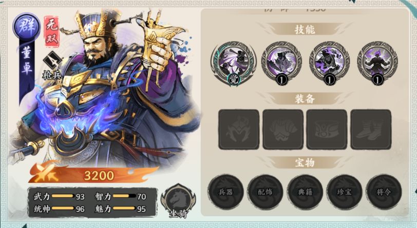 董卓的初始统帅值在四维中最高,优先选择增加统帅值的宝物。