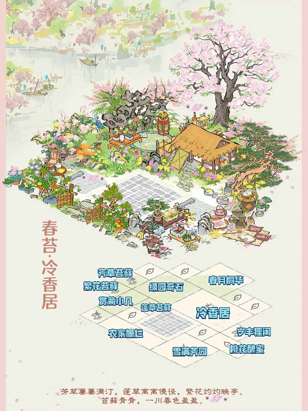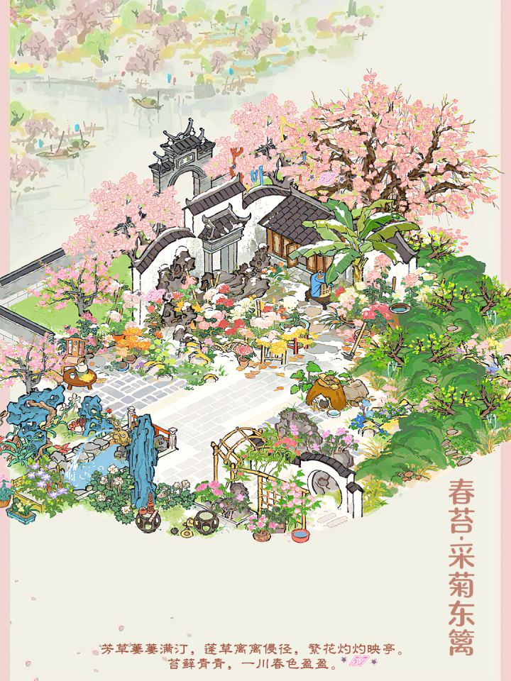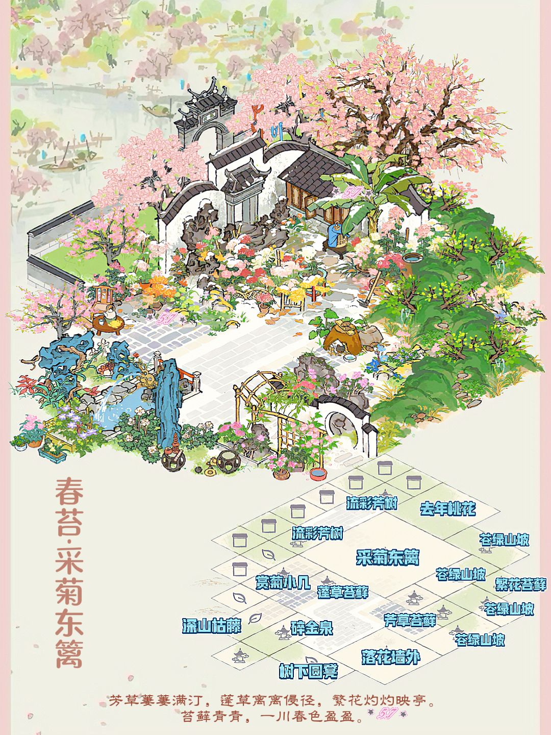 建筑:采菊东篱、去年桃花、苍绿山坡、落花墙外、赏菊小几、流彩芳树、蓬草苔藓、繁花苔藓、芳草苔藓岁丰狸闲、碎金泉、深山枯藤、树下圆凳、冷香居、春月桐华、绿园奇石、农家栅栏、桃花酿蜜