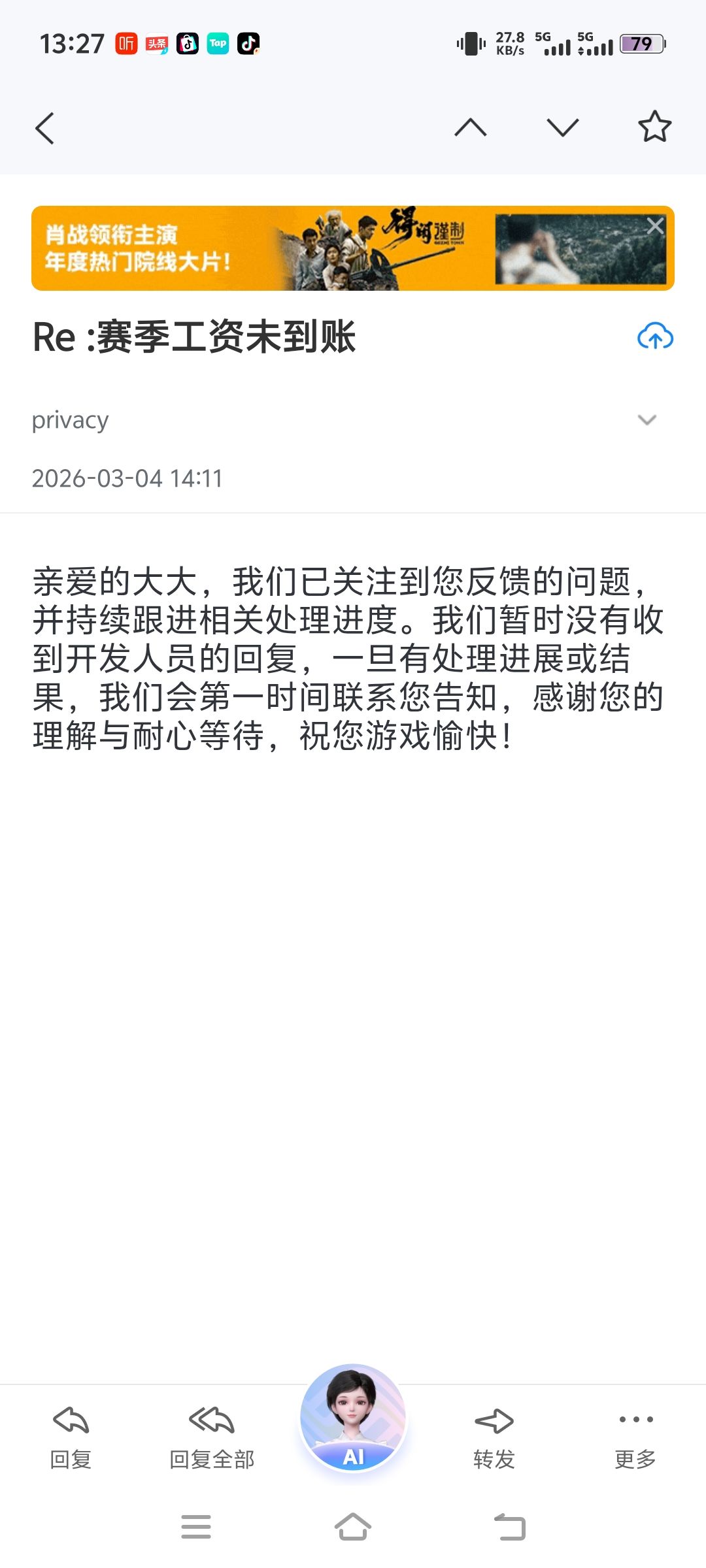 你们游戏毫无诚信,打完以后称赛季工资可以兑换现金,只有第一期给我兑换了,后来兑换直接不到账,一问你们就在等待回复中,从1月份拖到现在3月份,就是打算拖黄了,我所有的和你们聊天截图都有,如果你们不回复,我就去315投诉你们