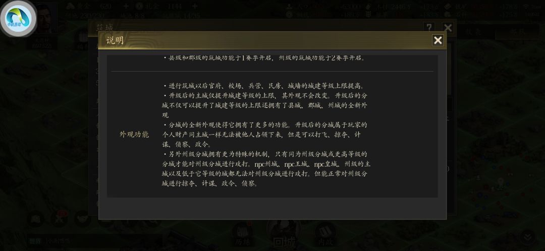 2.筑城,可以筑城为州级,15级建筑(相当于皇城等级)。州级分城,无法被州级分城以外的城池进行攻占(击飞或者抓将)。