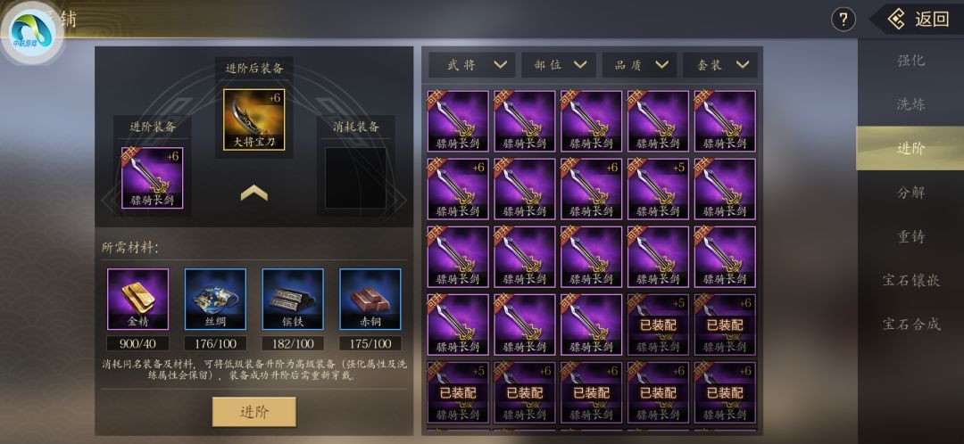 3.进阶装备。相对于现在版本,进阶套其实比普通橙色装备强不了多少。(现在版本主靠要吃丹药,丹药可以生效与战法,称号,临时符。)