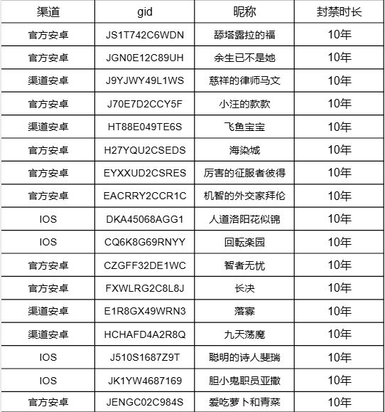 经核查,部分账号存在使用外挂,作弊及篡改账号数据的违规行为,故进行封停处理。近期作弊账号封停名单公示如下,为了公平的游戏环境,还请冒险家们多多理解,珍惜账号远离外挂哦~