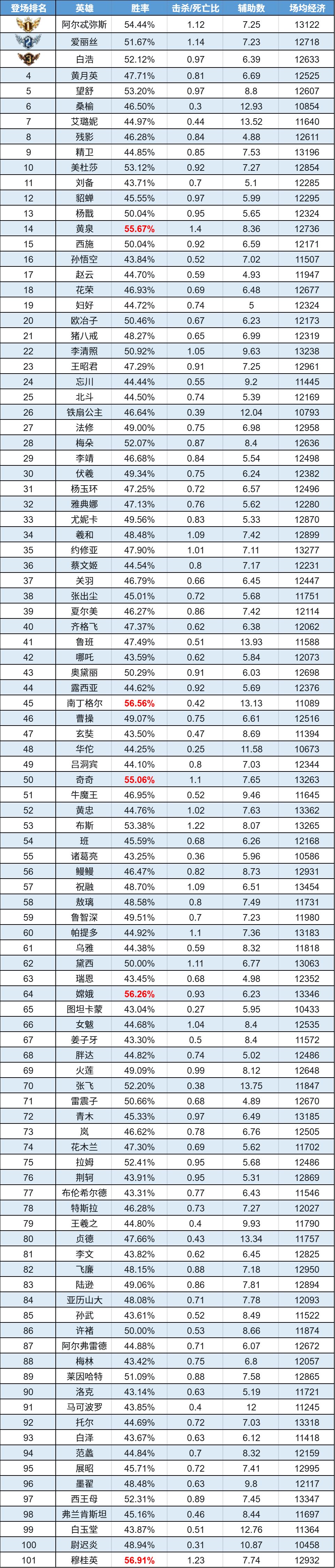 【高段位】艾璐妮、刘备、阿尔忒弥斯成为热度前三“钉子户”。南丁格尔胜率实现五连冠,莱因哈特上榜。飞廉蝉联场均经济TOP1。