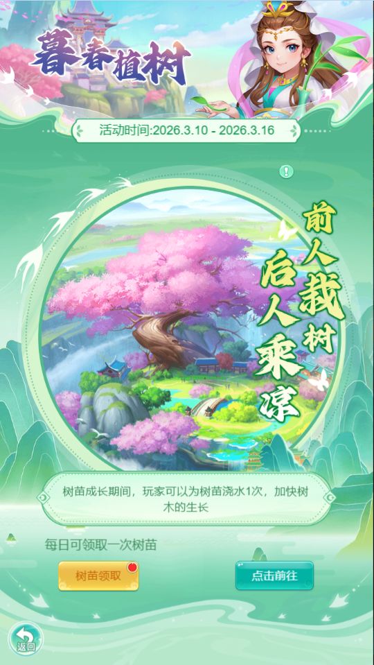 1.少主每日可为自己的植物浇水1次,浇水可加快树苗生长速度。树苗成熟后可获得丰厚道具奖励