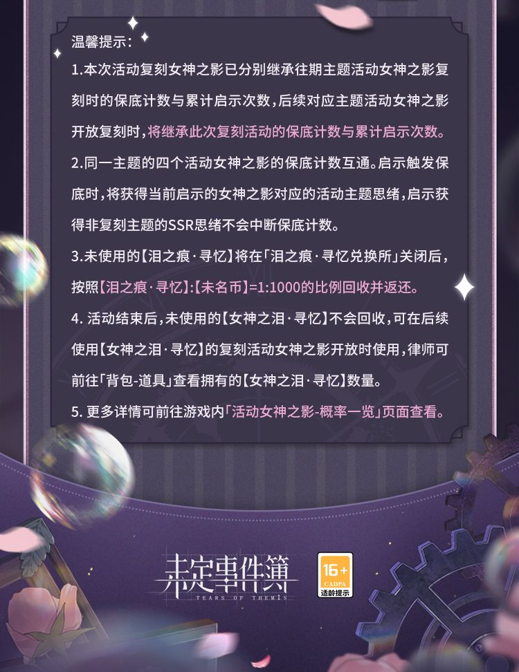 活动期间,律师可在复刻女神之影界面使用【女神之泪·寻忆】进行启示,每次启示可获得【泪之痕·寻忆】×1