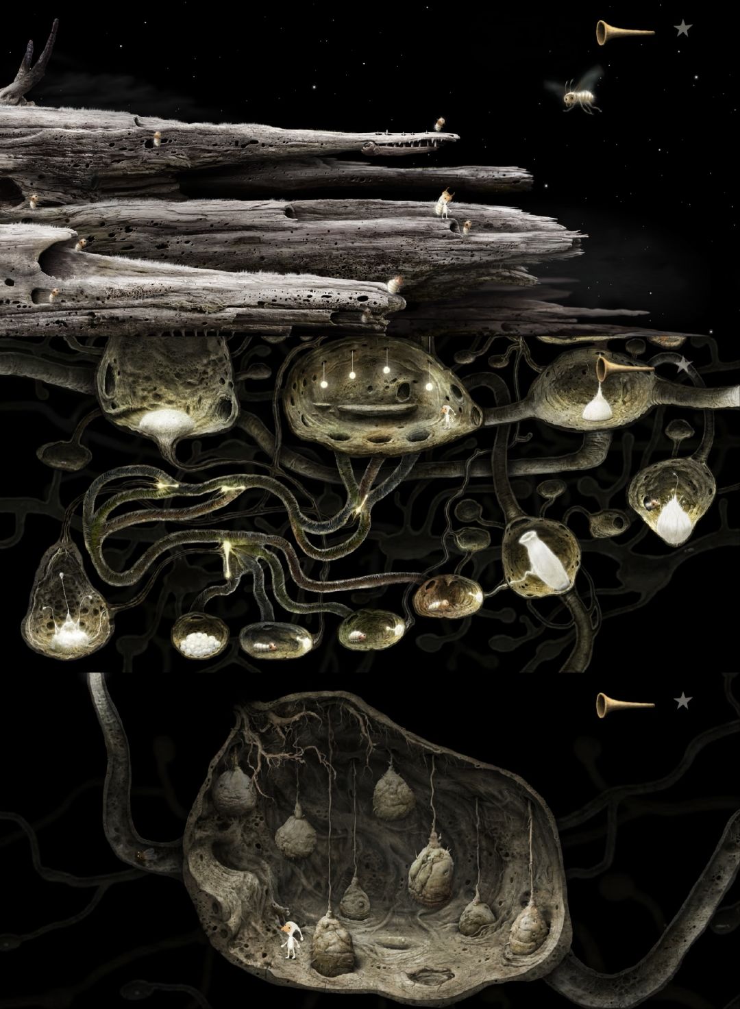 第三部仍以树精小男孩的视角展开,它偶然间得到了一个从天而降的喇叭。它在一本故事书里找到了喇叭的来历。这喇叭原是和尚的乐器,和尚队伍中有一人吃下黑色药丸,变得贪婪霸道,操纵邪恶机器人,抢走了其他3个和尚的喇叭,在银河系为非作歹。自此,小树精带着喇叭乘飞船往返银河系的9个星球,运用喇叭与各种生物交流,最终在月球机器人的帮助下打败坏和尚和邪恶机器人,喇叭也回到了各个和尚的手中。