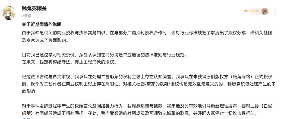 作者表示,经法律咨询与自我审视,已深刻意识到认知偏差,承认未获原创方鹰角网络正式授权前,二创形象无权主张商业权利,此前所有版权质疑与授权要求均无效。同时,他就未能引导粉丝理性发声,致使【白昼织梦】社团成员遭遇网络暴力、精神受扰一事致歉,承诺后续遵纪守法,彻底停止该形象的版权主张,也呼吁全网停止一切攻击与极端言论。