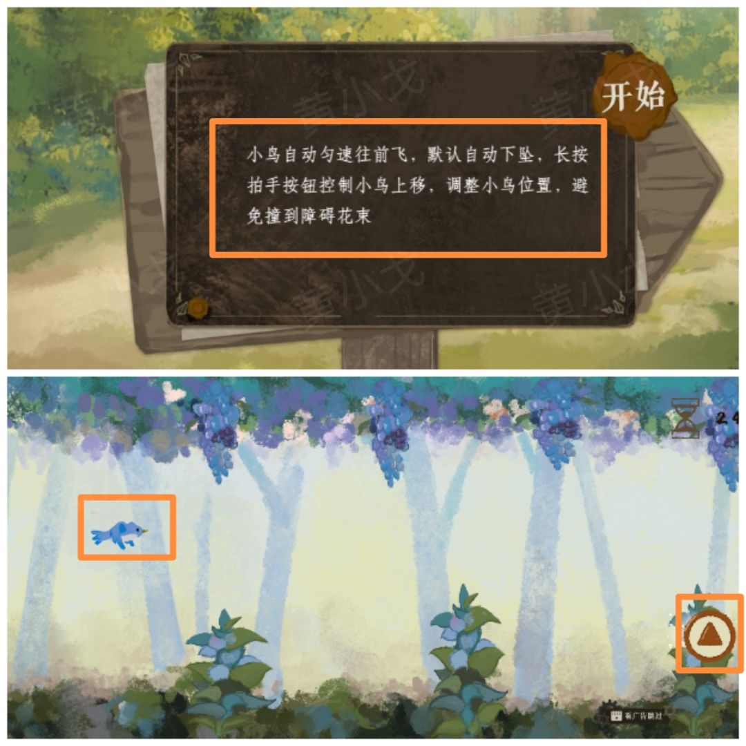 🔶游戏说明:小鸟自动匀速往前飞,默认自动下坠,长按拍手按钮控制小鸟上移,调整小鸟位置,避免撞到障碍花束。