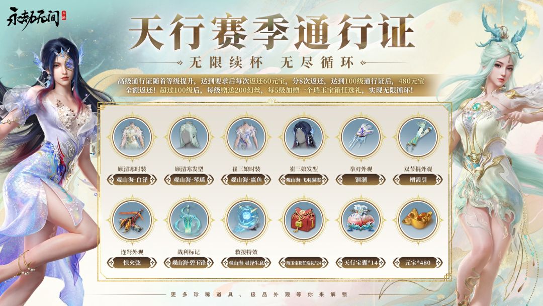 超过100级后,每级赠送200幻丝,每5级加赠一个瑞玉宝箱任选礼!每个赛季还能享受价值超24000元宝的道具,聚窟洲性价比天花板,千万别错过!