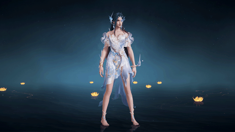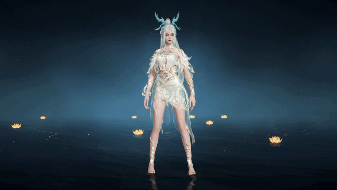 灵白锦裙嵌着玉髓与金纹,白羽肩披衬得冰姿卓然;鎏金缠纹绕身如流云,翠玉佩饰垂襟似凝霜,腕间金环映光清冷。