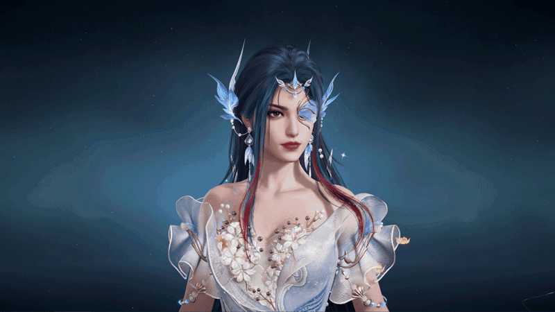 以墨蓝鲛丝绾成双鬟,发尾染霞,鬓间用晶蓝蝶饰与银链点缀,利落又带着清艳灵动,透着深海的绮韵。