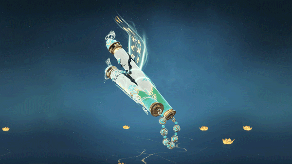 整体以青白玉为主体,棍身嵌青金着流云纹络,棍头凝冰晶呈霞焰之形,棍尾垂玉珠串还坠着青琅璎珞,清隽又透着山海的灵韵。