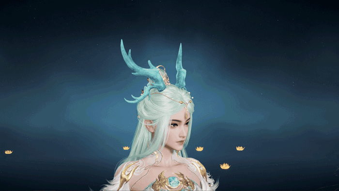 以青碧渐变丝发为底缀满鎏金珠饰,额间缠枝金链垂玉坠灵动清雅似山海凝云;