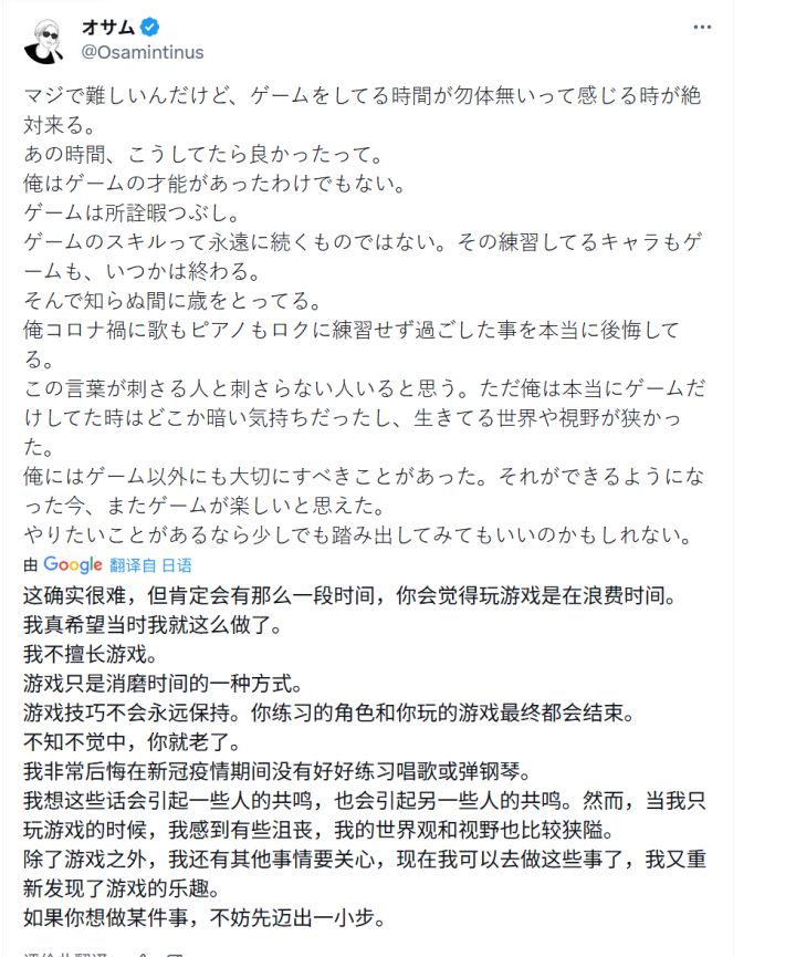 近日,知名博主在社交平台发文称,有那么一刻他深深觉得打游戏是浪费时间,打游戏培养出的娴熟技巧会随着时间流逝而生疏,后悔没有将这些时间用于其他事情如练琴等。