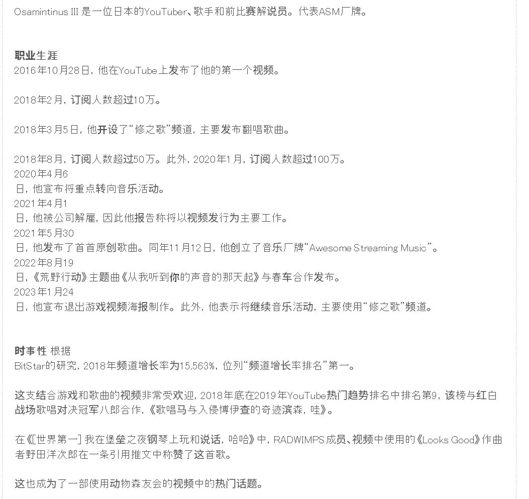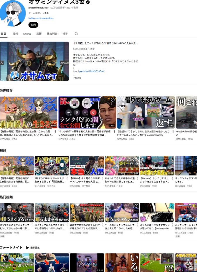 据悉该博主为知名YouTuber、歌手及前游戏实况主Osamintinus(オサミンティヌス3世)该博主两个账号,一个是游戏解说账号,百万订阅,油管百万订阅,什么含金量不言自明。