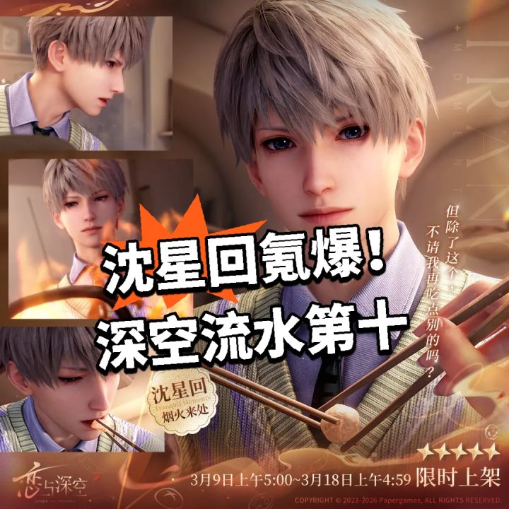 发、被视为国产乙游天花板的3D恋爱互动手游《恋与深空》今天推出了全新五星思念限时UP许愿「烟火来处」限时卡池
