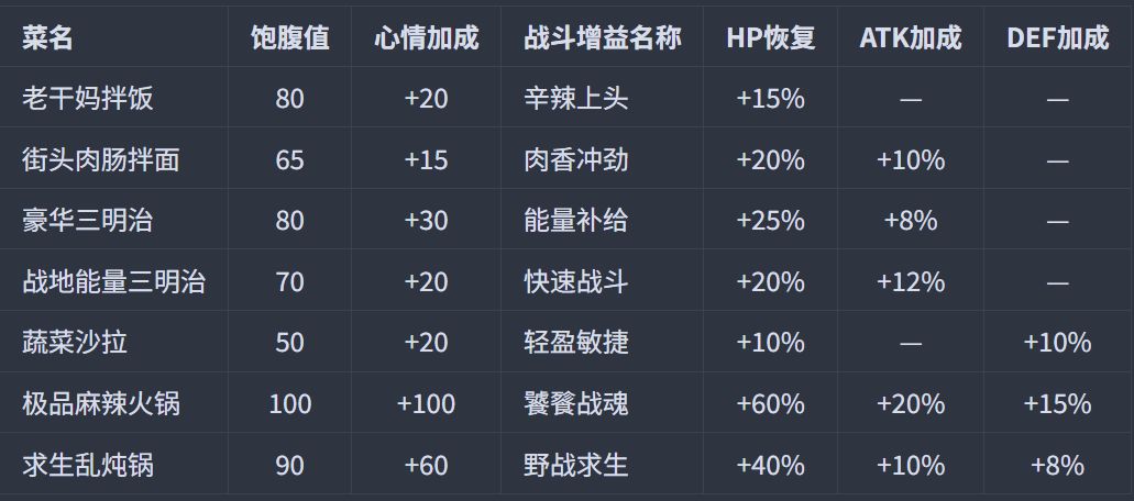 烹饪产出全面升级,做好的食物直接变成战斗物资,吃完不仅能回复吃喝状态,还能触发5分钟生效战斗buff,生存打架两不误,厨艺也能成战力!