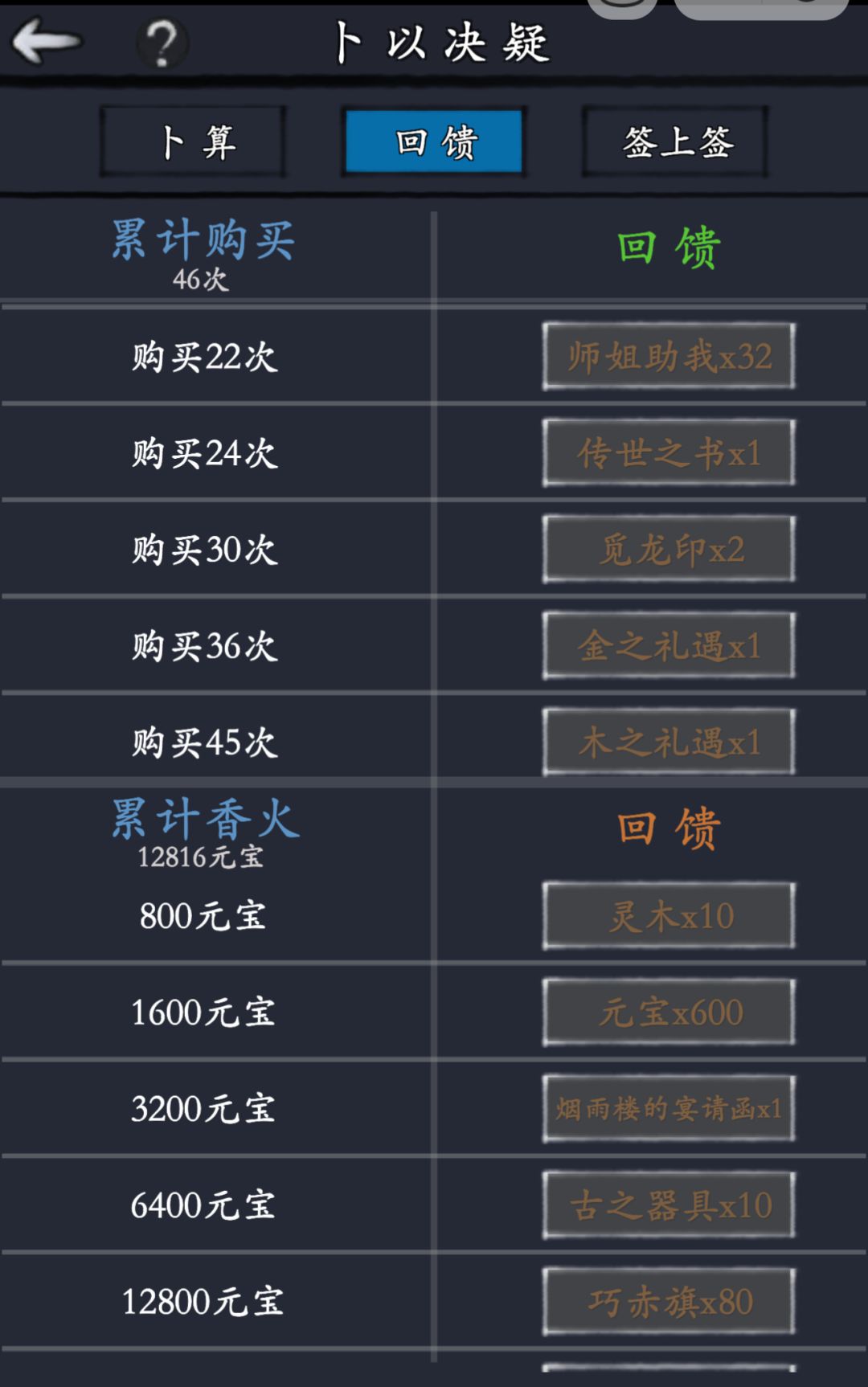 卜卦的本质就是用师门任务换积分 用积分去抽奖买打折的资源,有人说买古董好 有人说买阴阳好,仁者见仁智者见智,需要什么买什么 当下的快乐才是对最重要的 你最需要的才是最能带给你快乐的。老江湖会在活动开始的前一周就攒满一背包的红色任务用来刷积分,一个红色任务12分,卜卦一天十次是75积分,这么算依旧是不够45次的,那么好!重点就是怎么氪!首先推荐30元的加速包并且有555元宝,这样再加上一天两个的小礼包,是很有可能凑够45次的!(需要在卜卦中买师姐快跑刷任务 以备不时之需)如果客官觉得要看运气还得买师姐备着太麻烦!那么30元加速+每日6元礼包 是一定够45次拿木礼遇的!否则!否则!否则!