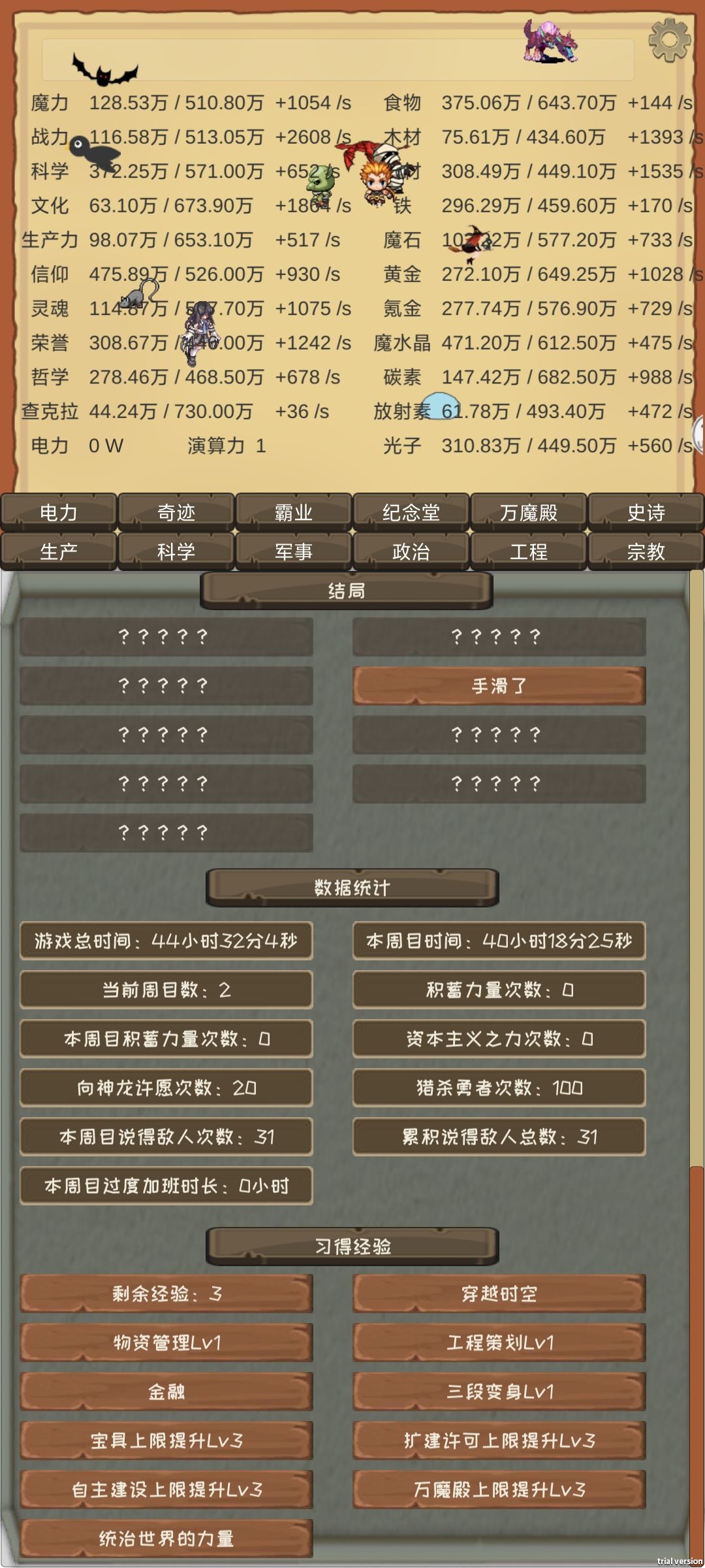 想要解锁全次元,精神修炼中信仰上限必须要点高,要不然后面解锁不了科技。(中途因为这个卡了快一个月了)