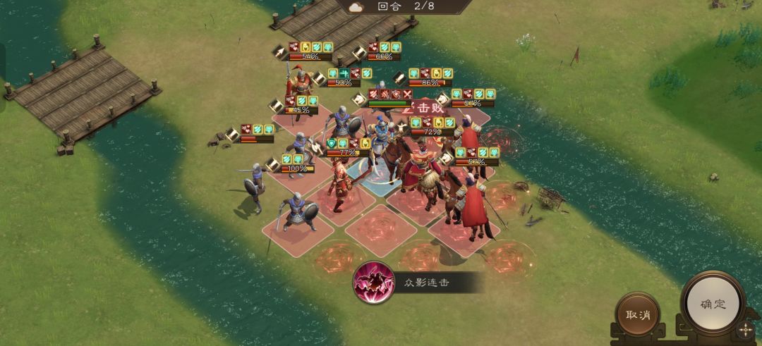 回合开始张辽前进到上图位置开技能奋强突固攻击敌人,并突进到前排敌人后方再动移动到孙权前边待机,用被动技能先杀一轮为敌人减血。