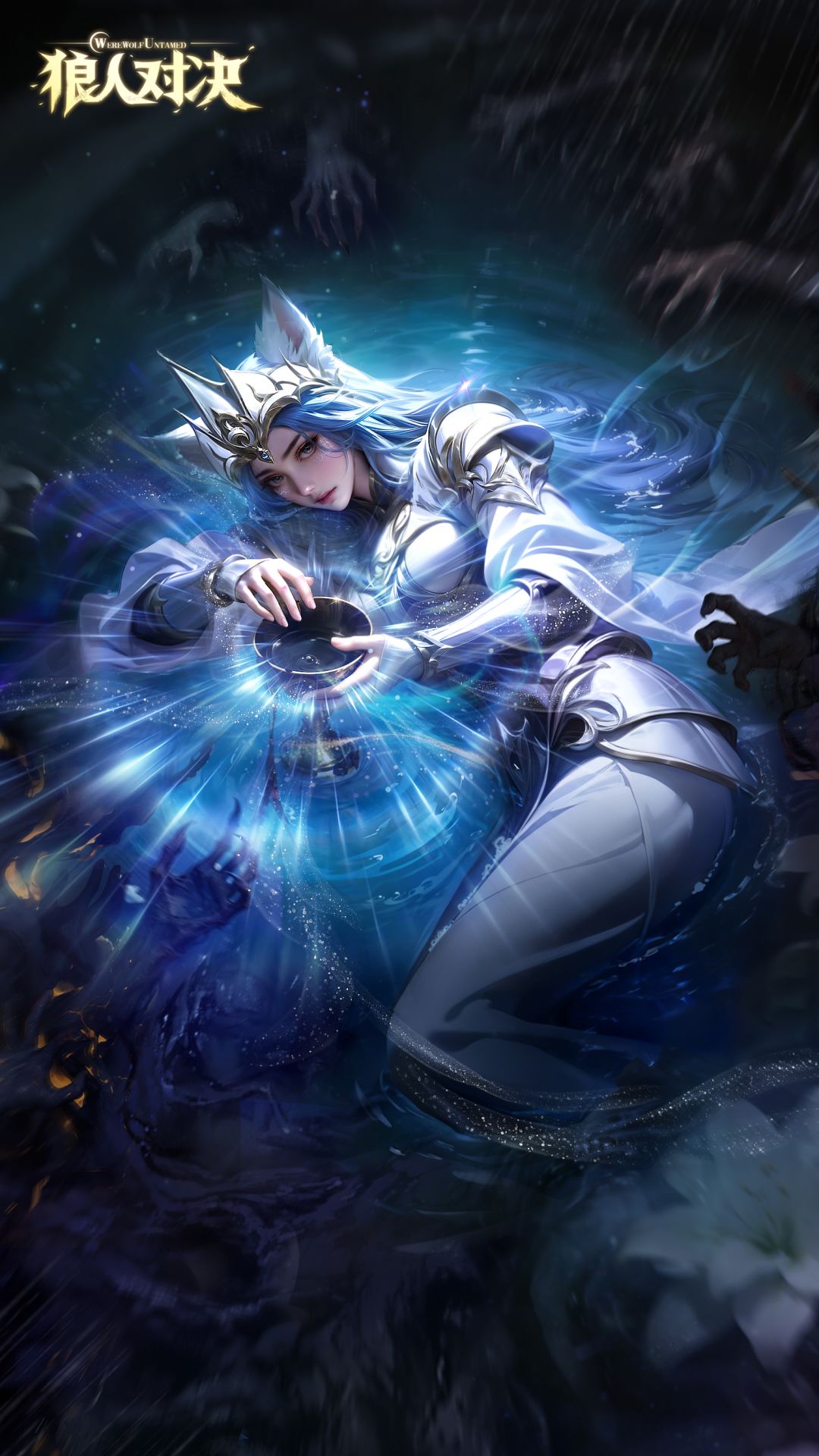 冰冷的泉水淹没她的身躯,白色甲胄被水光包裹。她双手托起圣杯,用苍月般冷冽的眸子凝视着它。