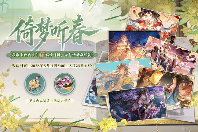 活动说明:每日参与乾门历练、四艺之争、景域寻宝,获得掉落道具【玲珑板】,消耗指定数量【玲珑板】解锁拼图,并在规定时间内拼合成完整的图形,即可获得花诏令、金叶子、乐府诗集、银纹玉樱等奖励。