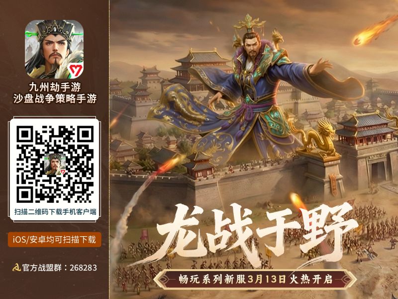 双沙盘策略手游《九州劫》3月13日(周五)畅玩系列新服火热来袭,感谢各位玩家对游戏的支持。本次开放服务器为全平台新服,支持安卓、iOS、电脑版多平台互通。欢迎各位君主大人进驻!