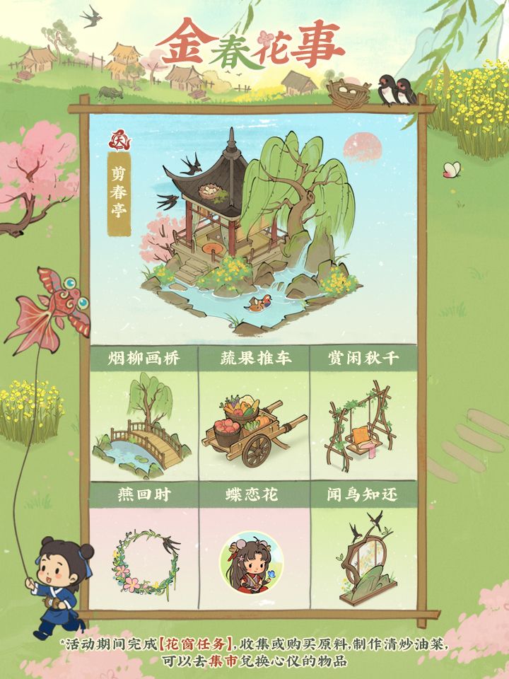 🍃兑换商店:使用「清炒油菜」、「春水煎茶」可在此兑换天级建筑「剪春亭」碎片、限定头像「蝶恋花」等奖励。