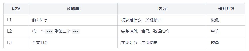 AI 会先扫 L1,只有相关的才继续读 L2/L3。**不相关的模块只花 L1 的积分。**