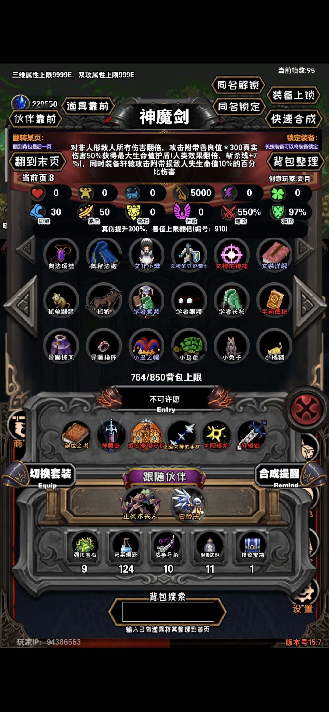 神魔剑(图八):善恶值*300的真伤,获得生命值100%生命护盾,非人形生物强制伤害翻倍(这游戏后期基本都没有人形生物),敌人已损生命值10%伤害+7%斩杀线