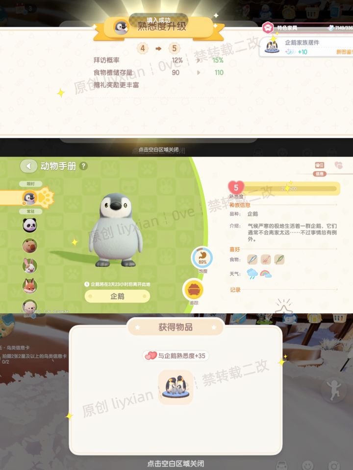 。可惜到目前为止,企鹅熟悉度奖励还没拿满,摆件差两个,拼图差一个,礼物太难刷了,感觉有点难毕业,不知道企鹅离开后,还能不能通过生活碎片(熟悉度4级解锁)的方式获取。