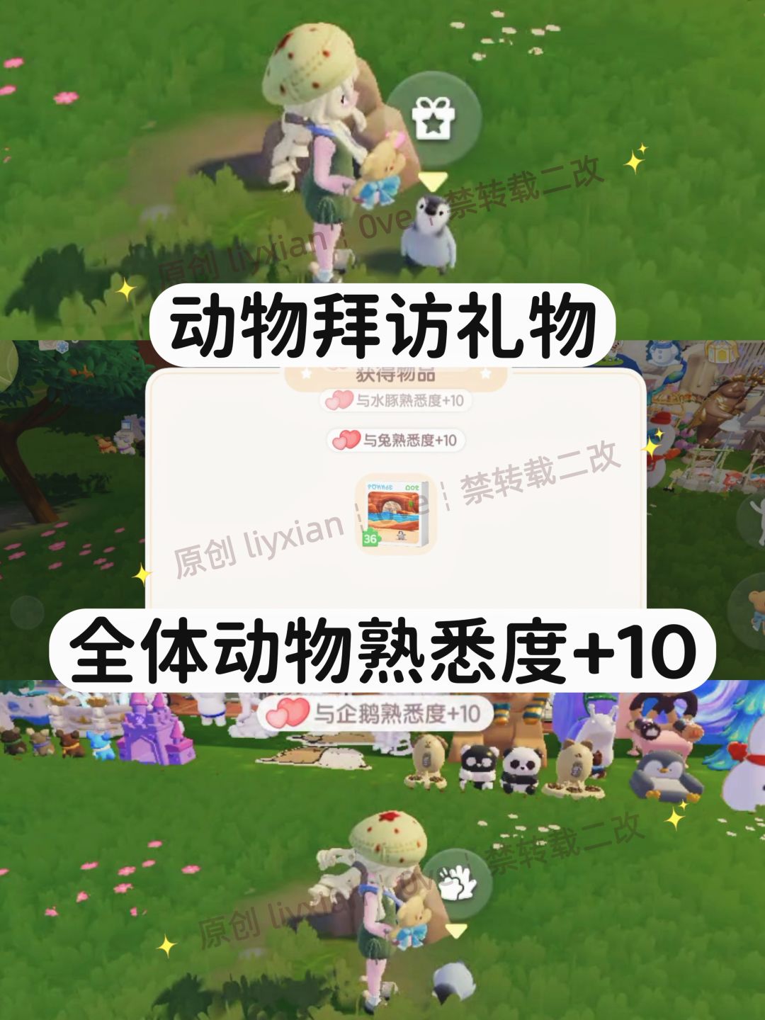 每次领取礼物后,全体动物各+10点熟悉度,一天可以加30熟悉度。