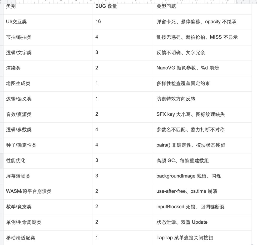 类别无需预先定义,随 BUG 积累自然涌现。当某个类别累积 3 个以上 BUG 时,说明该领域是“事故高发区”,需重点关注。以下是 1 个月开发中总结的 15 个类别及核心信息,适配 TapTap Maker + Lua 开发场景:
