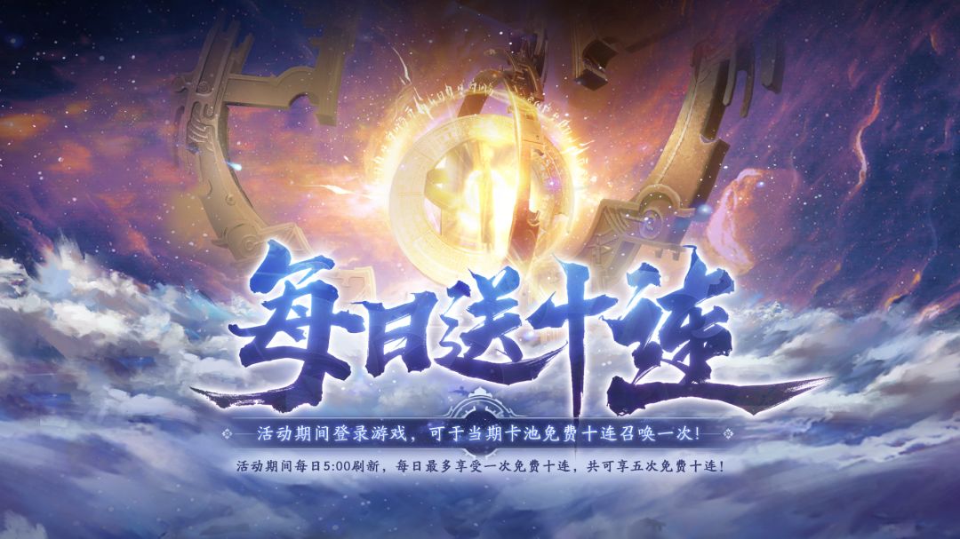 活动期间,每日可于当期时轮召唤及所有限定卡池内免费进行「十连召唤」1次,最多可享5次,共计免费50连!(该活动和时轮召唤每日免费「召唤一次」不冲突)