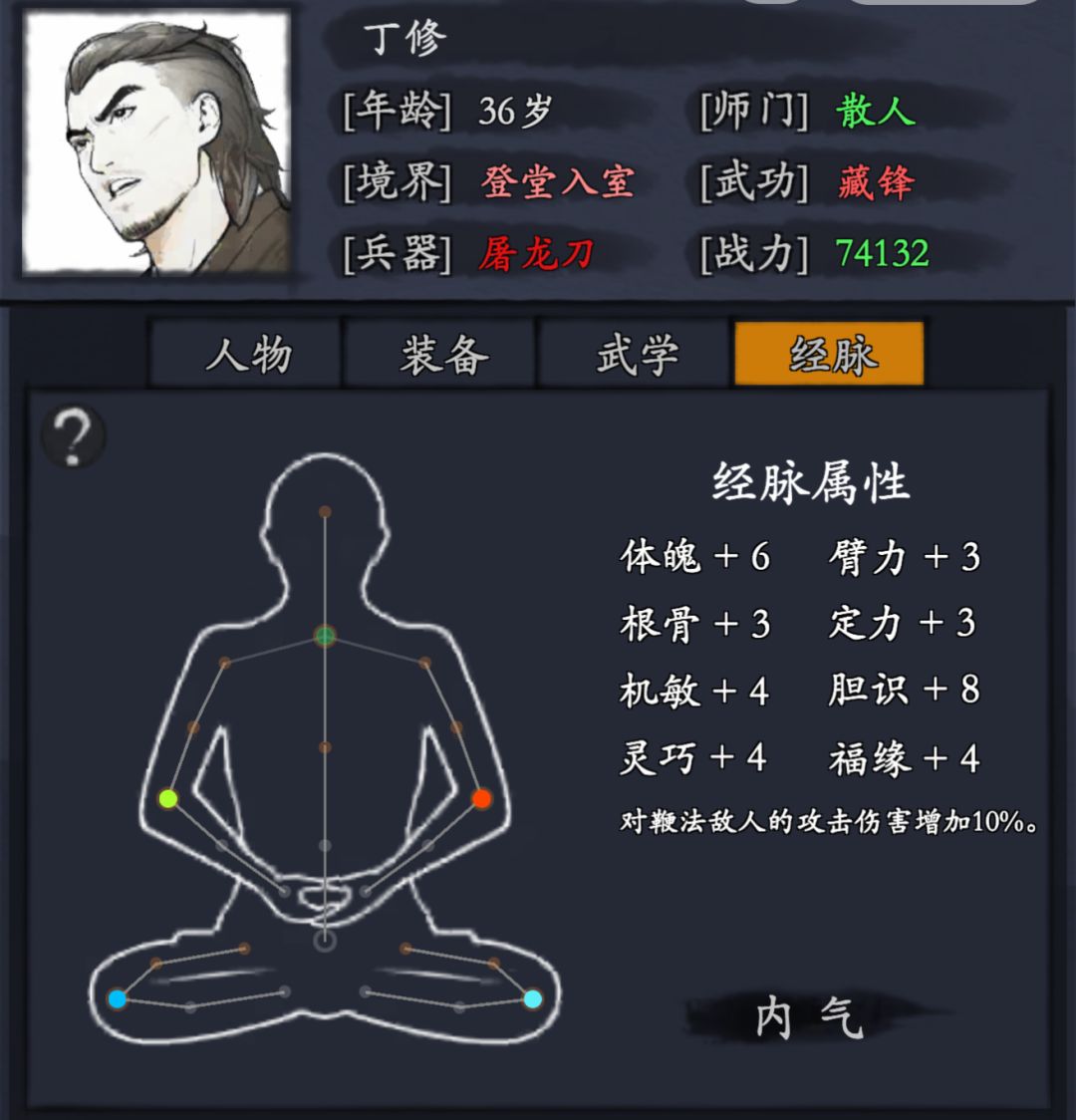 一般来讲,一个活动侠客的培养成本要4000-5000人民币上下才能保证你养出来的侠客不是残疾(主c),否则就和我一样如下图(请忽略我的装备和内气 懒得调整随便装的 别学),绣春刀活动刚出的时候 丁修的强度还没有被看见(至少没有被我这个萌新看见)所以基本上就是6元档 30元档有一搭没一搭的氪着玩(喜欢收菜的感觉)。等我回过头的时候发现已经来不及了,不论是丁胡体系还是丁修公孙都是历练通天逃课的好阵容,一丁甚至能砍翻“你湖全知全能的神”(老区信息,今天贴主夺舍了个老区的号)(小青也能打平,小青单体很强萌新也可以养一个打单挑),2丁配罗的必中沉默清图,但作为活动侠客来讲残疾的就是残疾的(你大概率等不到返场就永远都是残疾),氪佬和平民就是在这里拉开的距离,本人三脉 无专武 技能点如下图大约消费几十块人民币(当时为了赌云游 甚至开福袋拿银两…),重点就在这,你要么一次性拉满 要么就每天的活动补补签白嫖元宝(桃桃的日常),像我这种残疾的活动侠客后面是很难玩的 很乏力,从有丁修出现开始 后面的云颠丁修一定会是常客(这一场已经看到强度了),而活动侠客比的就是氪度(碎片),至于我们要么一次氪够 要么一分不氪(立志让你湖一分钱赚不到)!