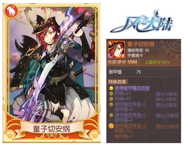 童子切安纲是一张特殊的破甲魂卡,他不仅能赋予你破甲值属性助力你突破觉醒副本荣耀前线,还拥有一个特殊的手套技能——破甲嗜血。