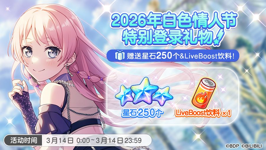 今日内登录游戏可以获得特别礼物哦!此外,游戏内还将追加白色情人节特别语音,请务必登录游戏听听看呀♡(o⌒.⌒o)