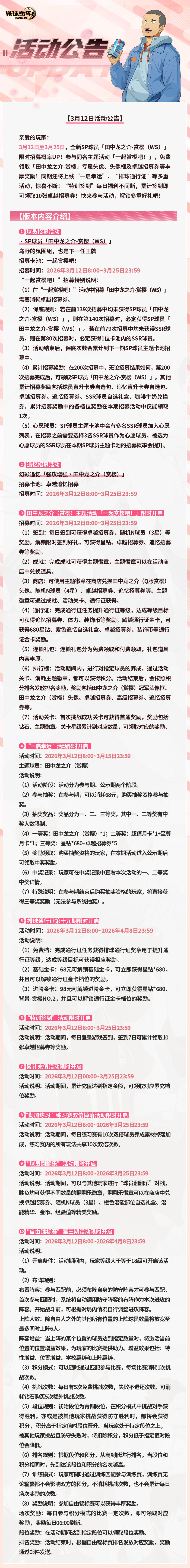 3月12日 ~ 3月25日,全新SP球员「田中龙之介-赏樱(WS)」招募概率限时UP!参与同名主题活动「一起赏樱吧!」限时开启,参与可获得田中龙之介(赏樱)专属头像、卓越招募券等丰厚奖励!