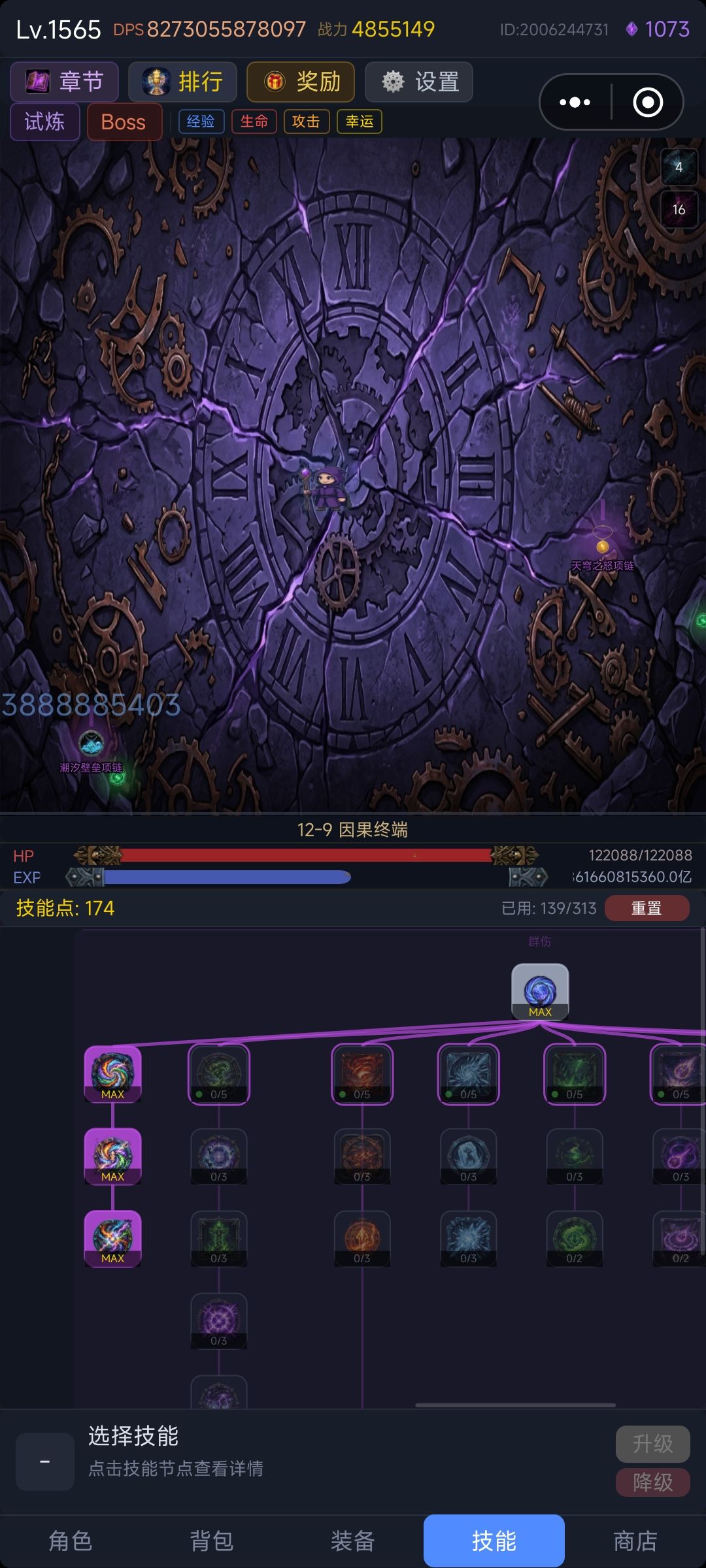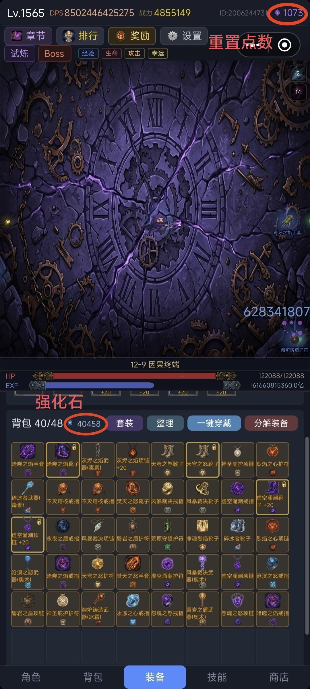 4.接着是你的用什么强化,技能点和加点怎么重置需要的重置点数。强化石打死小怪boss均会掉落(强化装备),重置点数只能打boss关卡才能获得,一只boss等于1点重置点数,没错你没看错就是一点!!