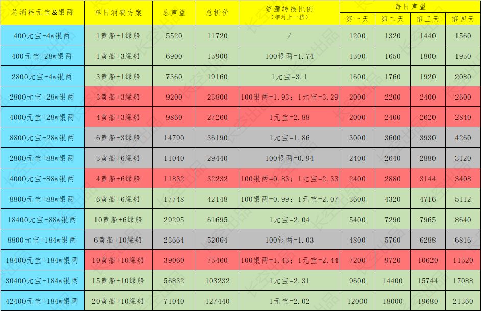 由于东海客来既是最大的银两回收站,又有相当优秀的元宝消耗上限和性价比,因此“活动分析篇”的所有篇章,将以东海客来作为参照系,去给出元宝、银两的推荐消耗方案。
