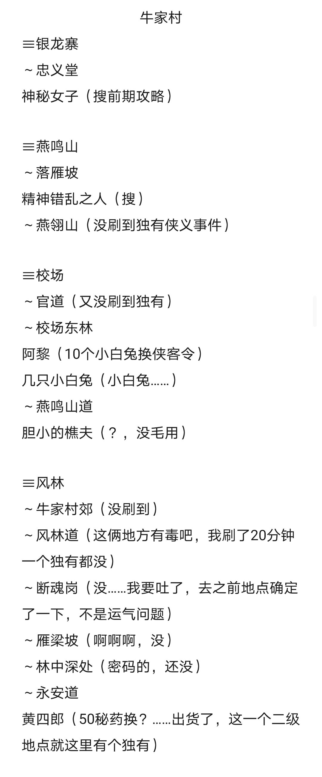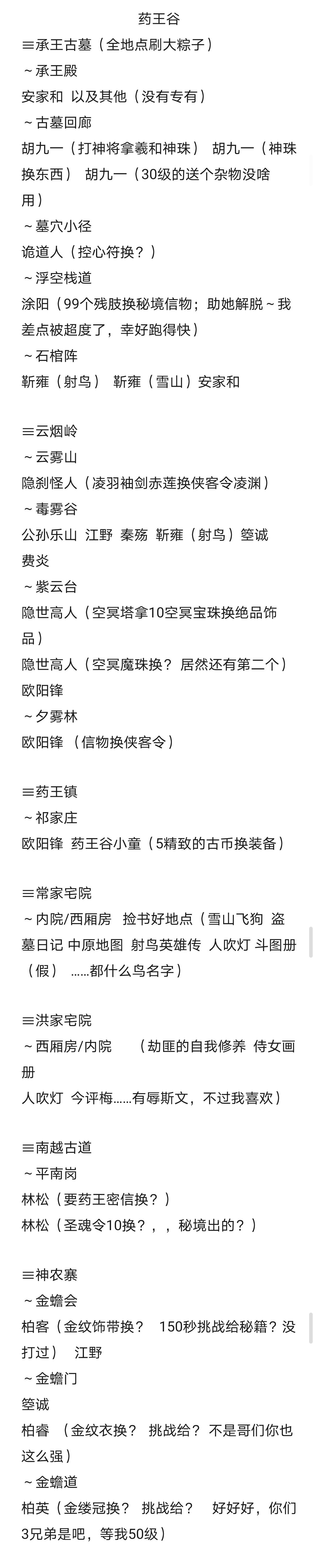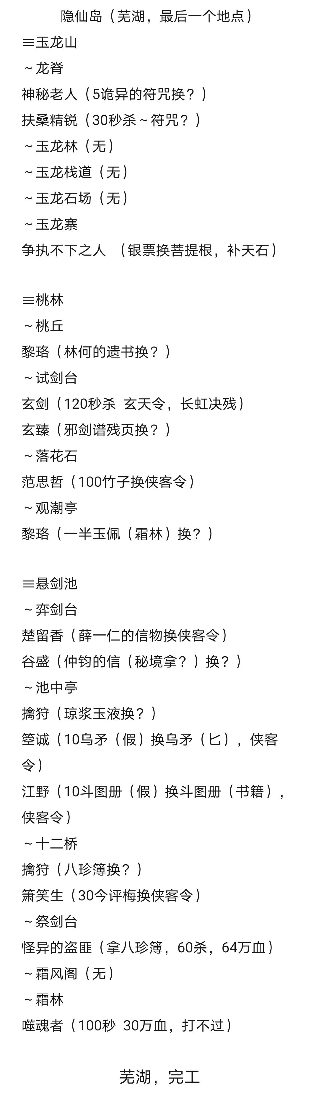 肝了挺久,每个地点独有的侠义事件大部分记载了,需要的物品,掉落的物品,记载无的都是没有或刷了半天没刷出独有的侠义事件的地点(大部分前面常出现的侠义事件还是有的,未记载的地点均无侠义事件,天都/隐刹俩大地点一个侠义都没。地图从左到右,从上到下,每张图有1-2个大地点。