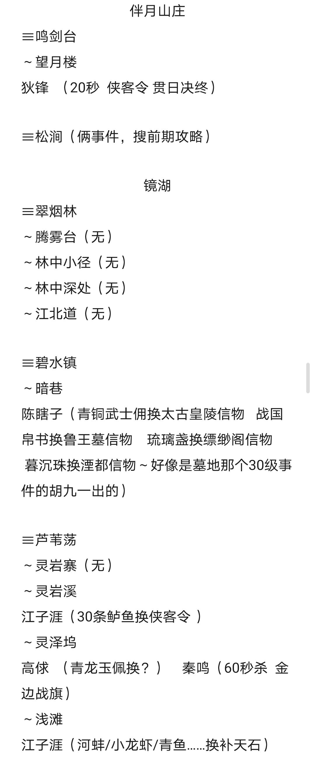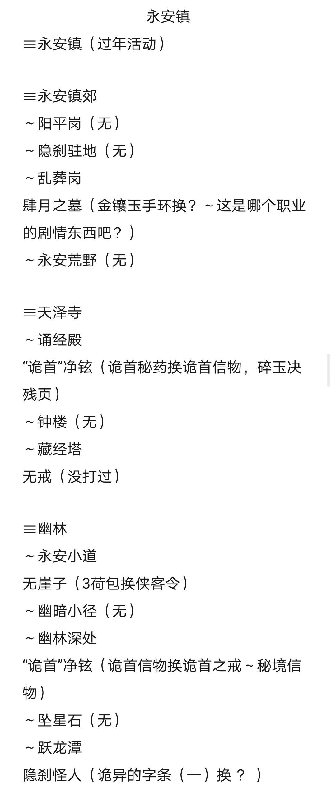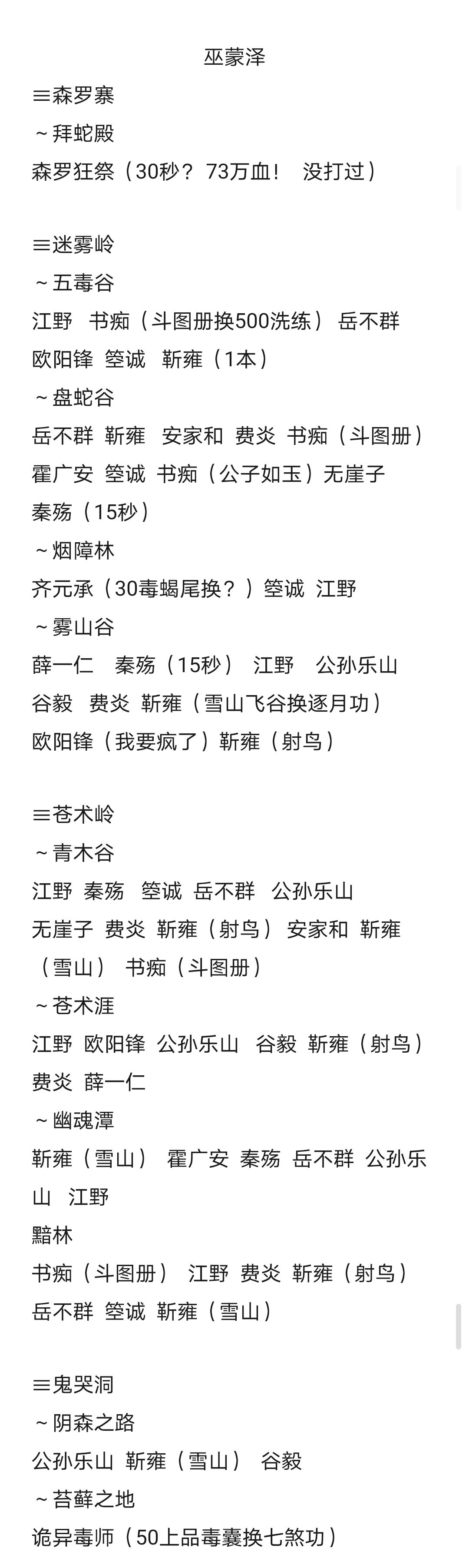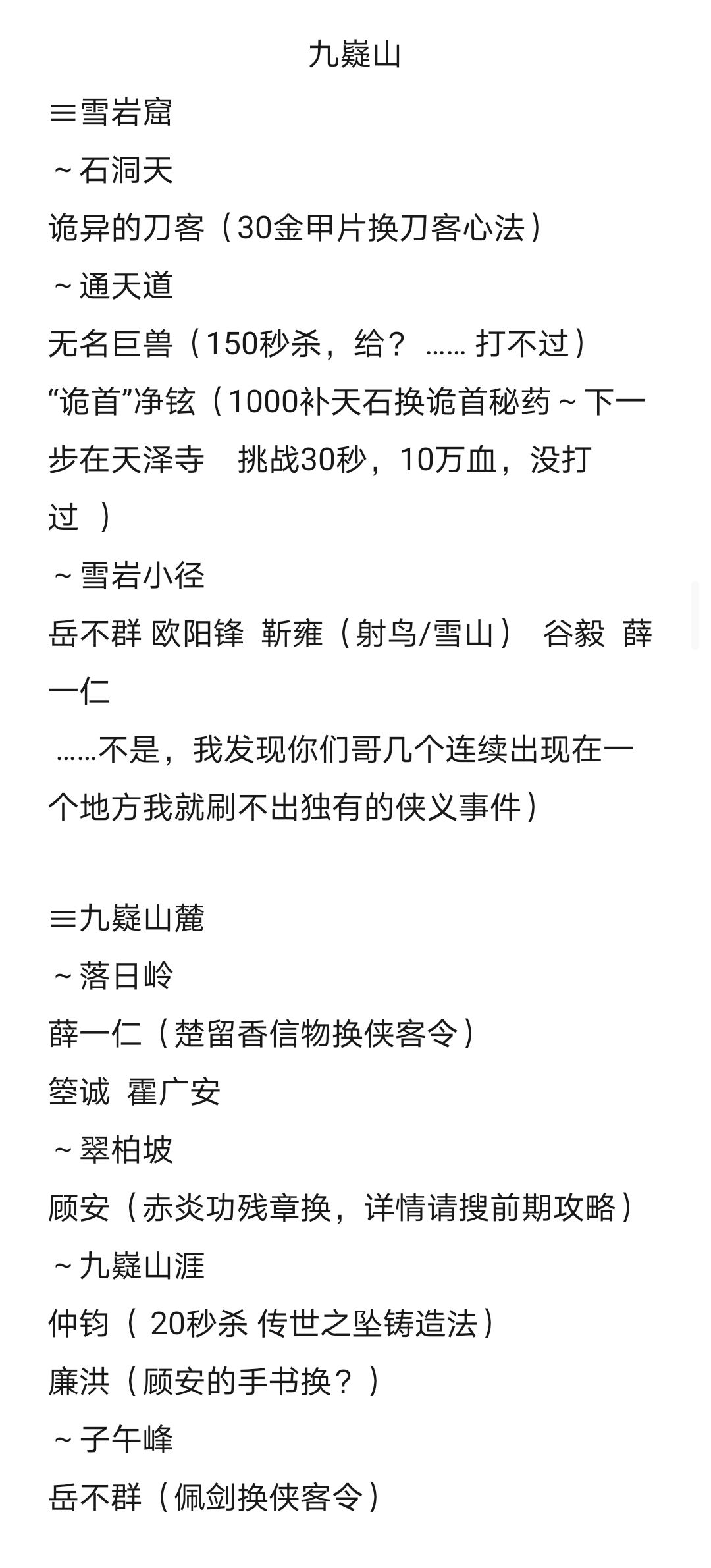 肝了挺久,每个地点独有的侠义事件大部分记载了,需要的物品,掉落的物品,记载无的都是没有或刷了半天没刷出独有的侠义事件的地点(大部分前面常出现的侠义事件还是有的,未记载的地点均无侠义事件,天都/隐刹俩大地点一个侠义都没。地图从左到右,从上到下,每张图有1-2个大地点。