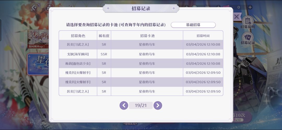 10连必出sr,给我出来一大堆,我都有了。两个10连开出了一大堆我有的普通角色。单抽了3发出来了一个ssr,结果还是我有的。真崩溃了。